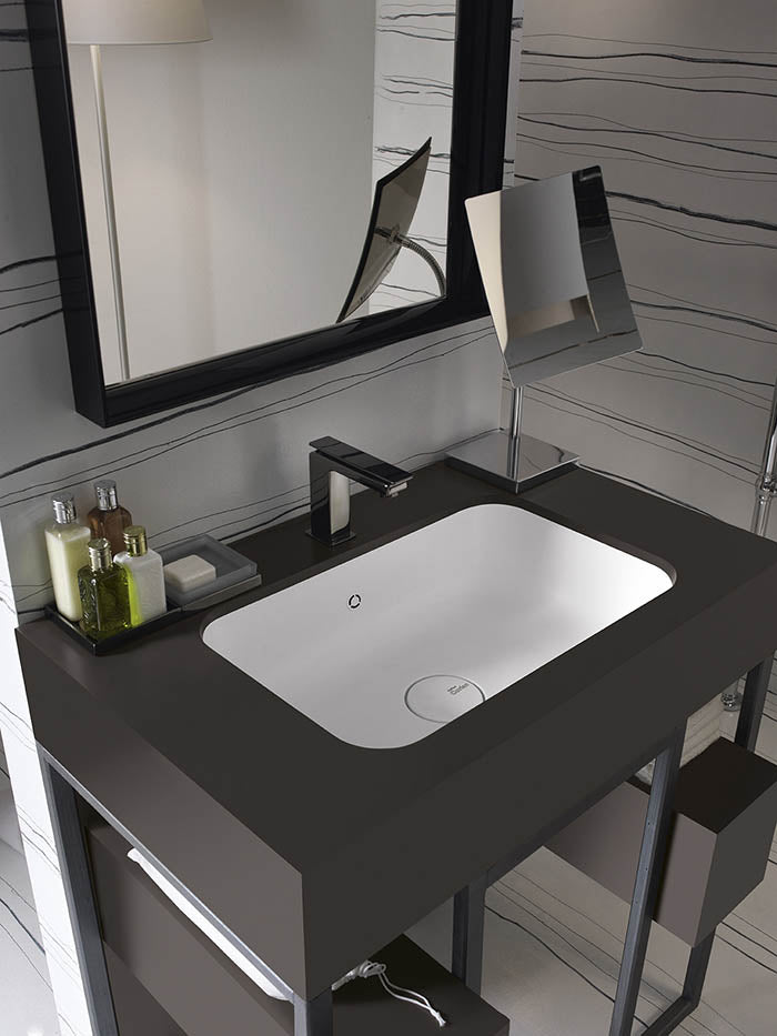 Corian® baðvaska er hægt að fá í öllum formum en eingöngu í hvítum lit. Þó svo vaskarinr séu hvítir er alltaf hægt að setja þá undir Corian® plötur í öðrum litum. Þá myndast sjáanlegur litamunur á samskeytum þar sem vaskurinn límist undir plötuna en engin finnanleg samskeyti. Corian® vaskana eigum við flesta til á lager.