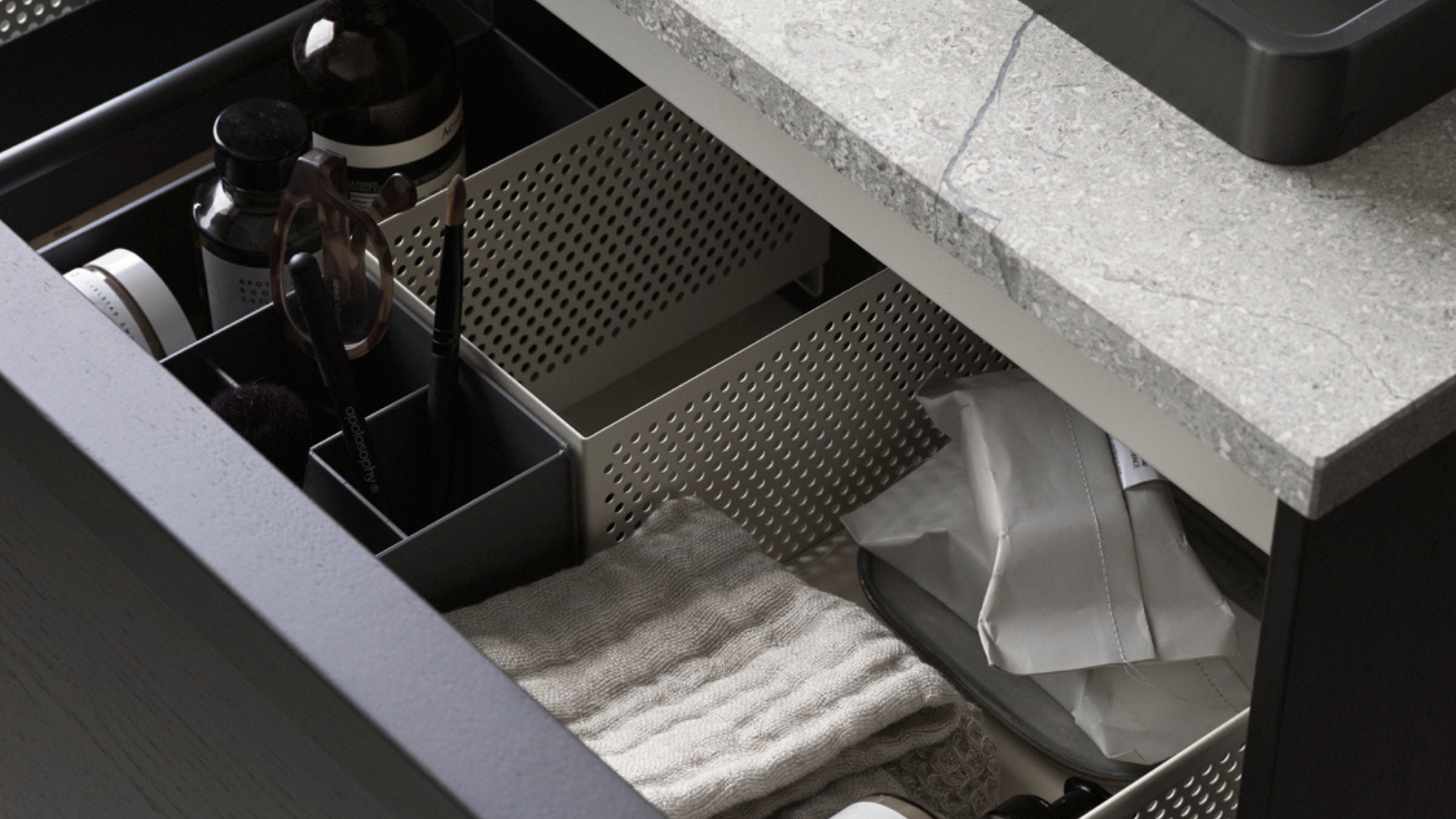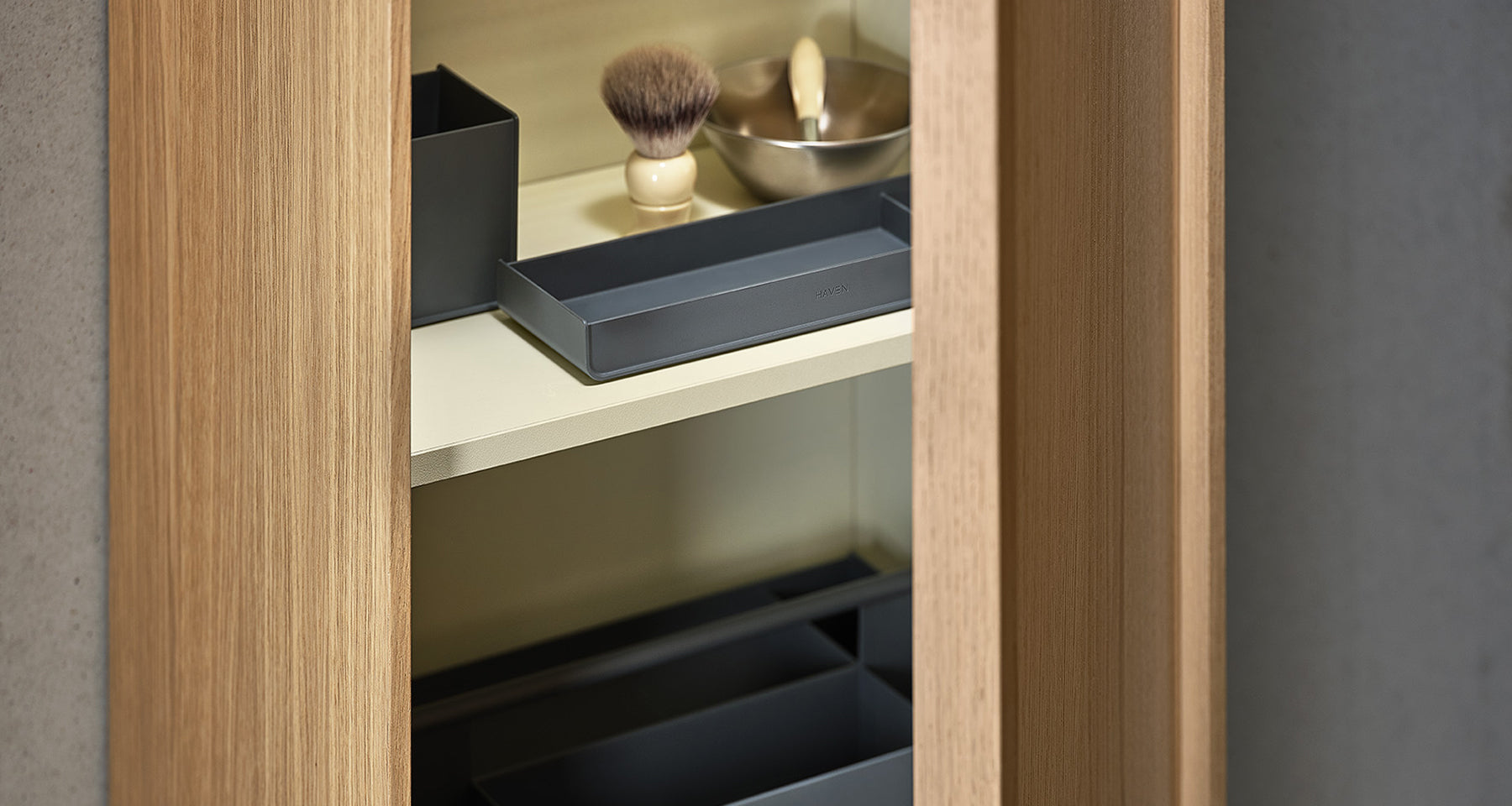 Öllum vaskaskápum fylgja innleggsbakkar í efri skúffum en hægt er að kaupa viðbótareiningar. Bakkar og box eru öll unnin úr maíssterkju og öðrum náttúrulegum efnum og því niðurbrjótanleg í náttúrunni án mengunar.